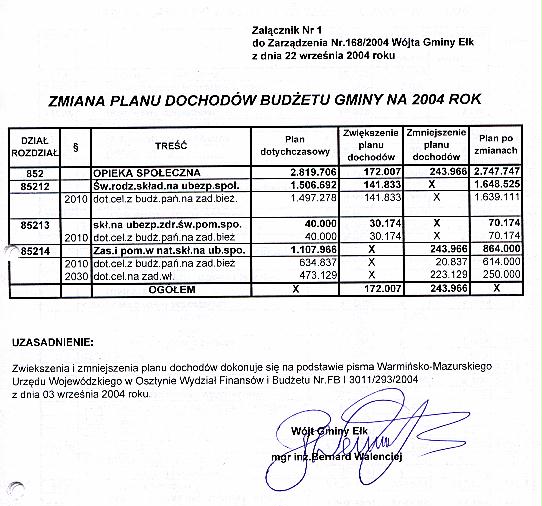 - Zarządzenie Nr 168/2004 z dnia 22 września 2004 r. w sprawie zmian w budżecie Gminy na 2004 rok, Załącznik Nr 1, Załącznik Nr 2, Załącznik Nr 3