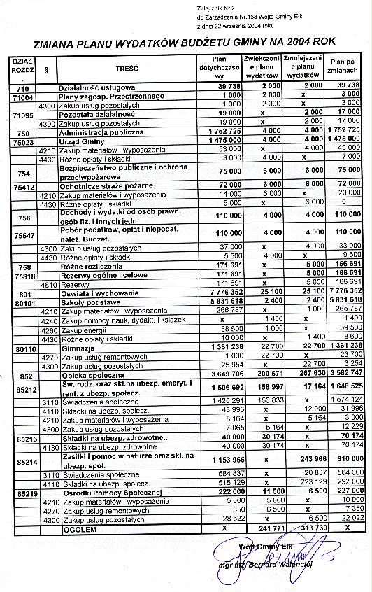 - Zarządzenie Nr 161/2004 z dnia 02 sierpnia 2004 r. w sprawie zmian w budżecie Gminy Ełk na 2004 r. Załącznik Nr 1, Załącznik Nr 2, Załącznik Nr 3.