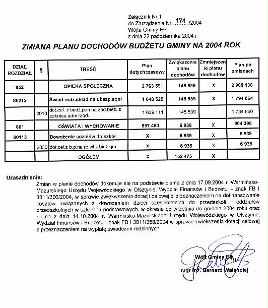 - Zarządzenie Nr 174/2004 z dnia 22 października 2004 r. w sprawie zmian w budżecie Gminy na 2004 rok, Załącznik Nr 1, Załącznik Nr 2, Załącznik Nr 3