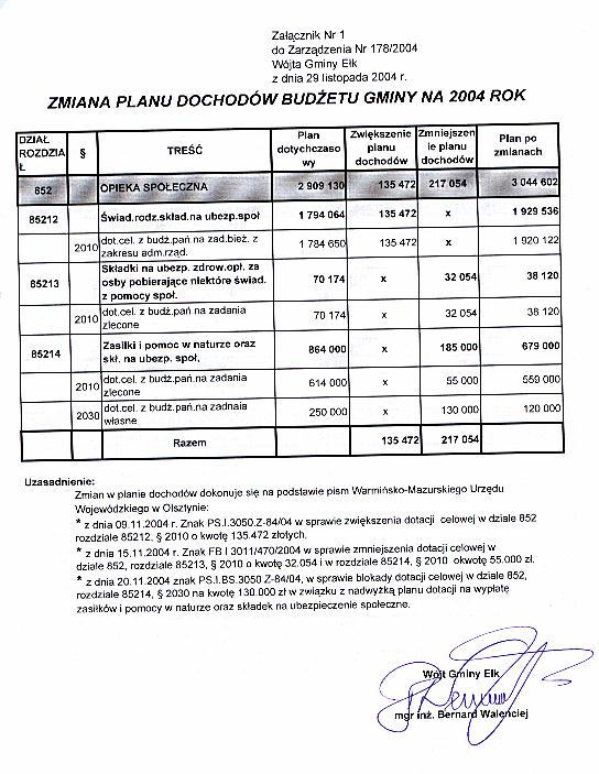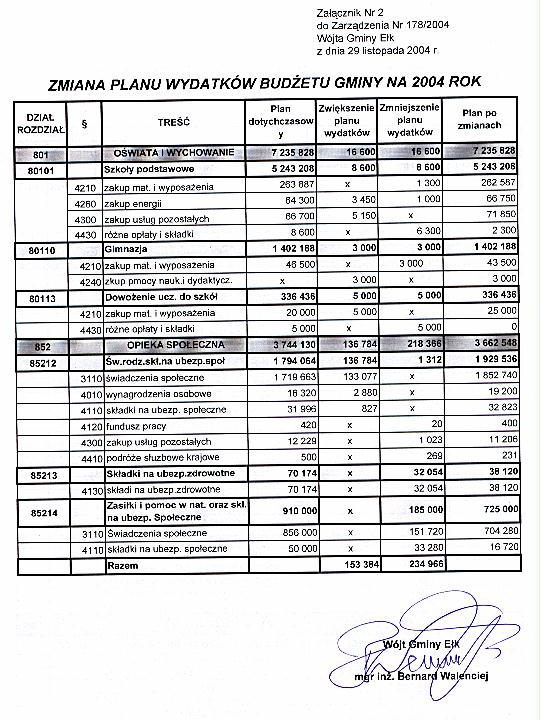 - Zarządzenie Nr 178/2004 z dnia 29 listopada 2004 r. w sprawie zmian w budżecie Gminy na 2004 rok, Załącznik Nr 1, Załącznik Nr 2, Załącznik Nr 3